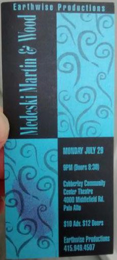 | 7/29/1996 | MMW | Cubberly Community Center, Palo Alto, CA | One Set Only: Chinoiserie, Lifeblood, Is There Anybody Here That Love My Jesus, Macha > Caravan > Wiggly's Way, Henduck > Jelly Belly > Drum Solo, Night Marchers > Dracula, Bass Solo > Chubb Sub, Moti Mo | 121:33 | 2264 t s |