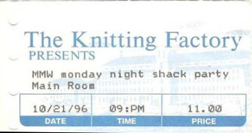 | 10/21/1996 | MMW | Knitting Factory, New York, NY | Shack Party VI; Set 1: Improv#* > Drums# > Improv#*+ > Improv#*+, Open Improv^% > Drums'n'Bass > Improv^% > Improv^%, Gramma's Hands+^$@, Chain of Fools+^$!@; Set 2: Improv& > Improv^%@~ > "Going Home"^%@~, Improv=, Open Improv= > Crosstown Traffic=; # with Eddie Bobe (congas); * with Vernon Reid (guitar); + with DJ Logic (turntables); ^ with Daniel Carter (saxophone); % with Leon Gruenbaum (Samchillian Tip Tip Tip Cheeepeeeee); $ with Juliana Nash (vocals); ! with Jennifer Jackson (vocals); @ with Oren Bloedow (guitar); & with Ben Perowski (percussion); ~ with Steven Bernstein (trumpet); = with David Fiuczynski (guitar) & Dean Bowman (vocals) | 159:27 | 1457 t t t s |