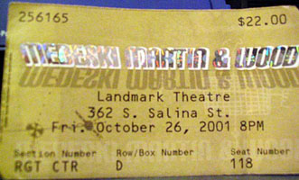 | 10/31/2001 | MMW | Beacon Theater, New York, NY | Set 1: Open Improv > Improv > Improv > Improv, Think > Bass Solo > Shacklyn Knights > Blue Pepper > Open Improv; Set 2: Percussion Procession+, Percussion Improv+ > Dracula+, Improv > We Are Rolling > Fire > Smoke > Drum Solo > Big Time > Jelly Belly^; Encore: Bass Solo > Gonzo, Bubblehouse; # with Marc Ribot from Think to end of show (except Gonzo); * with Kid Koala and DJ P-Love from Dracula to end of show (except Gonzo); + with Whirligig Percussion Ensemble; ^ Going Home quotes at the start | 154:59 | 6158 t t -6647- s |