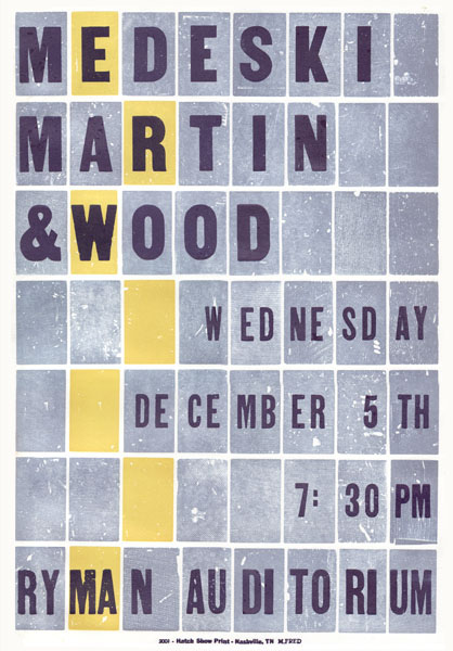 | 12/5/2001 | MMW | Ryman Auditorium, Nashville, TN | Set 1: Improv > Improv > Fire, Smoke, I Wanna Ride You, Is There Anybody Here That Love My Jesus, Big Time > Jelly Belly; Set 2: Bass Solo > Shacklyn Knights > The Dropper, Pappy Check > Wiggly's Way > Dracula > Partido Alto, Acht O'Clock Rock > Drum Solo* > Hey-Hee-Hi-Ho, Crosstown Traffic; Encore: Swamp Road; * 10-minute Percussion Solo, John & Chris left the stage, then came back to go into hey-Hee-Hi-Ho | 149:09 | 9100 s |