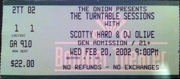 | 2/19/2002 | MMW | Turntable Sessions, Boulder Theater, Boulder, CO | No Setlist Available; The Turntable Sessions #1 - Winter 2002 (Boulder Theater - Boulder, CO) featuring: Billy Martin - curator, percussion, gadgets; DJ Olive (turntables); Scotty Hard (turntables); John Medeski (keyboards); Chris Wood (bass); Mike Ill (guitar, vocals); Min Xiao Fen (Pipa); Charlie Burnham (violin); The show originated in collaboration with NYC's EXITART LP Show last July. Each DJ improvises in a duet setting with the other instrumentalists and a final encore of the entire ensemble concludes. This is the first of a series of tours throughout the US and beyond this year. | 106:08 | 9518 s |