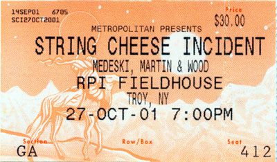 | 10/27/2001 | John Medeski & Chris Wood | guest with String Cheese Incident, RPI Fieldhouse, Troy, NY | 2 songs: Impressions > Superstition | 30:26 30:23 30:47 29:36 | LMA 5841 105611 t t LMA s |